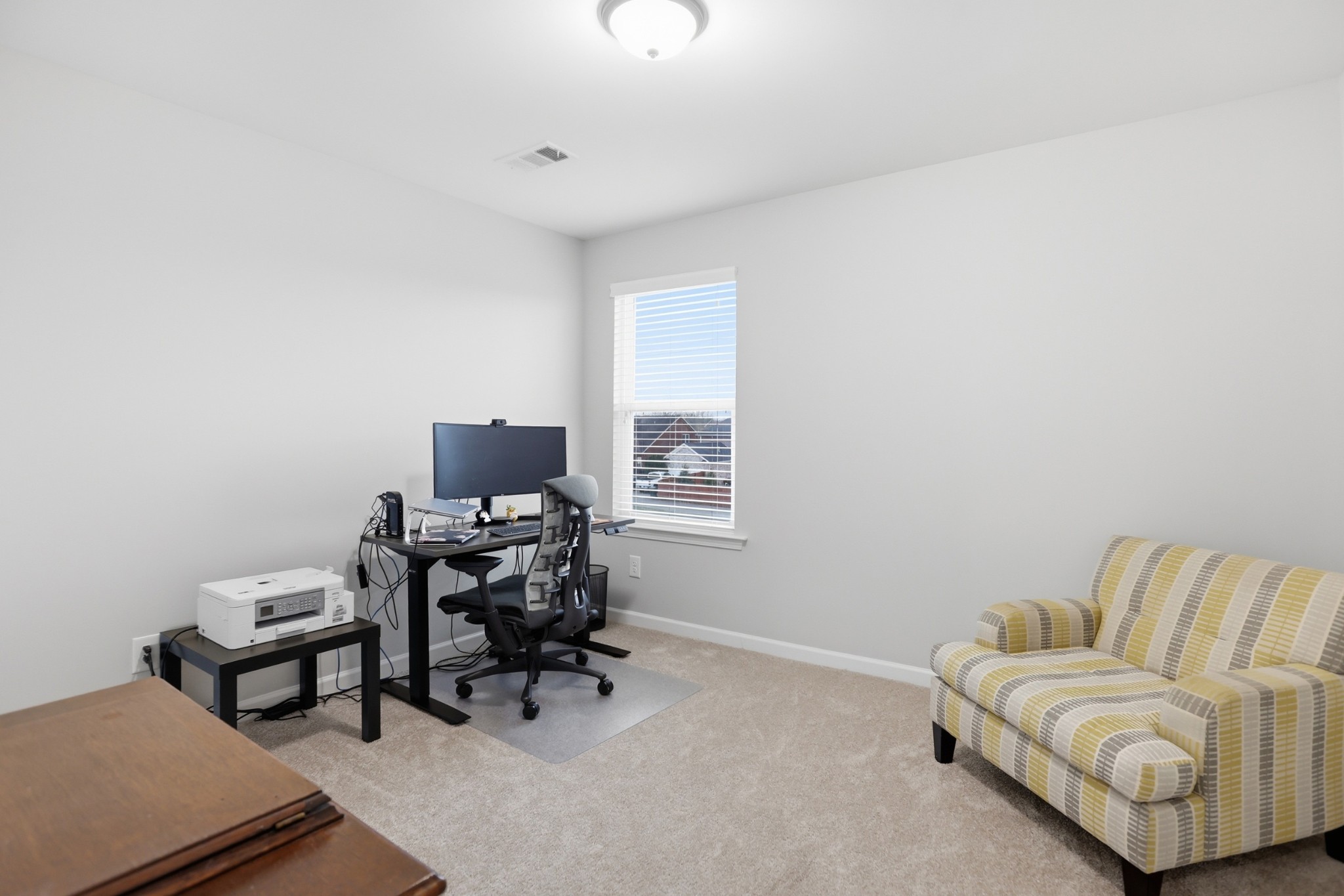 Step inside to a welcoming foyer that opens to engineered hardwood floors, fresh paint, and brand-new carpet, creating a bright and move-in ready feel throughout. The primary bedroom suite is conveniently located on the main level, providing privacy and easy accessibility. Primary bath includes built in speakers. Downstairs also features a versatile flex space, ideal for a home office, formal dining area, or additional living space.